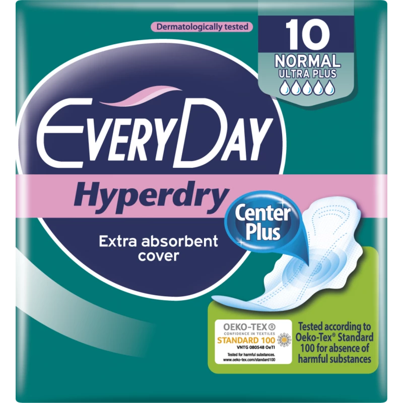 Ultra-thin sanitary napkin with protection wings. EveryDay Hyperdry Center Plus bring revolution in protection! Thanks to their special Center Plus technology, with a centrally reinforced core, they provide enhanced absorbency and maximum protection from side leakage where it is needed most! With super-absorbent cover. Dermatologically tested. The first napkins recommended by the Greek Union of Gynaecologists and Obstetricians and the first napkins in Europe to be Oeko-Tex® Standard 100 certified for absence of harmful substances.