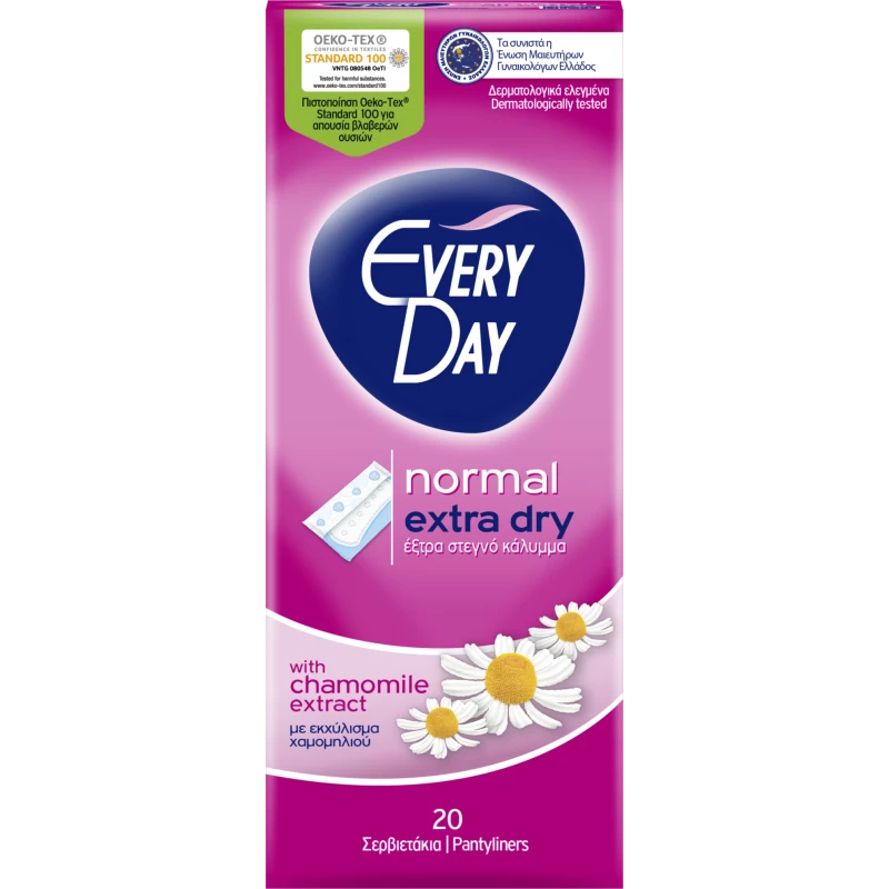 Anatomically shaped pantyliners of regular size. With extra absorbent top sheet for every day comfort and a safe protection. Enriched with chamomile extracts. Recommended by the Greek Union of Gynaecologists and Obstetricians. Certified by Oeko-Tex @ Standard 100 for absence of harmful substances. Individually wrapped.