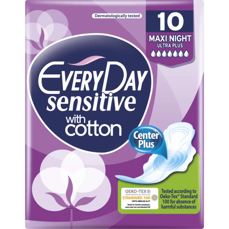 Ultra-thin sanitary napkin with protection wings. EveryDay Hyperdry Center Plus bring revolution in protection! Thanks to their special Center Plus technology, with a centrally reinforced core, they provide enhanced absorbency and maximum protection from side leakage where it is needed most! With super-absorbent cover. Dermatologically tested. The first napkins recommended by the Greek Union of Gynaecologists and Obstetricians and the first napkins in Europe to be Oeko-Tex® Standard 100 certified for absence of harmful substances.